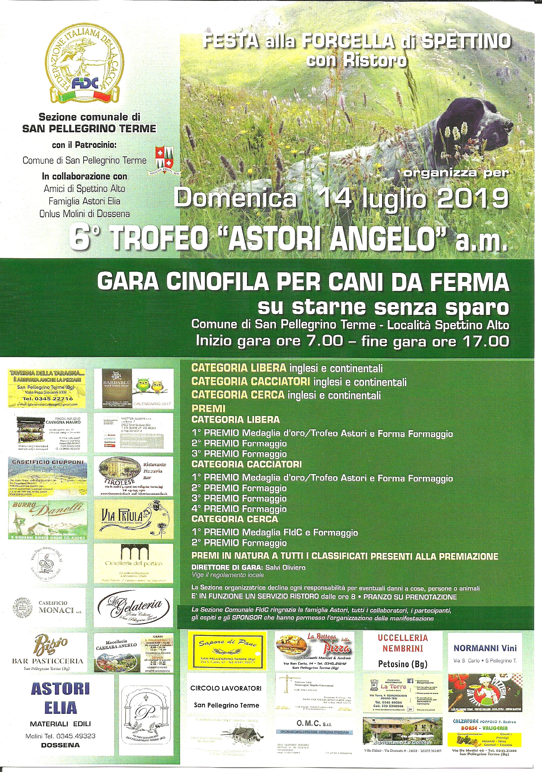 Domenica 14 la sezione di San Pellegrino Terme organizza il 6° Trofeo Angelo Astori alla memoria, gara cinofila per cai da ferma in occasione della Festa alla Forcella di Spettino con ristoro: inizio gara alle 7, fine gara alle 17 e al via le categorie libera, cacciatori e cerca inglesi e continentali.