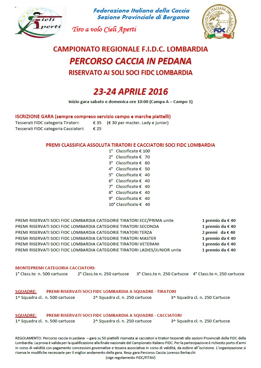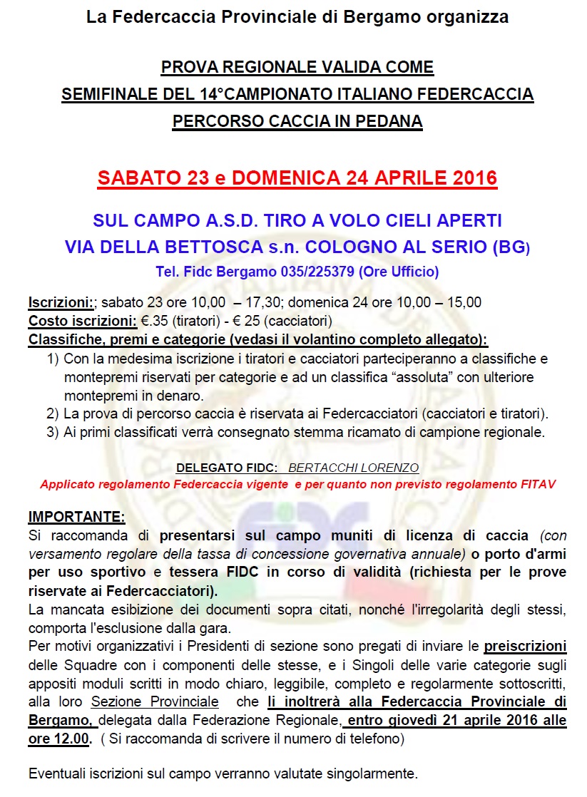 IMPORTANTE: Si raccomanda di presentarsi sul campo muniti di licenza di caccia (con versamento regolare della tassa di concessione governativa annuale) o porto d’armi per uso sportivo e tessera FIDC in corso di validità (richiesta per le prove riservate ai Federcacciatori). La mancata esibizione dei documenti sopra citati, nonché l’irregolarità degli stessi, comporta l’esclusione dalla gara. Per motivi organizzativi i Presidenti di sezione sono pregati di inviare le preiscrizioni delle Squadre con i componenti delle stesse, e i Singoli delle varie categorie sugli appositi moduli scritti in modo chiaro, leggibile, completo e regolarmente sottoscritti, alla loro Sezione Provinciale che li inoltrerà alla Federcaccia Provinciale di Bergamo, delegata dalla Federazione Regionale, entro giovedì 21 aprile 2016 alle ore 12.00. ( Si raccomanda di scrivere il numero di telefono). Eventuali iscrizioni sul campo verranno valutate singolarmente.