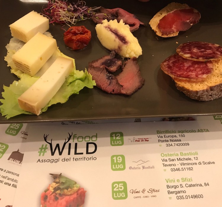 Proseguono le iniziative della rassegna estiva #Wildfoof “Assaggi del territorio”. Mercoledì 25 luglio l’iniziativa ha ‘abbandonato’ le valli per il centro della città di Bergamo nella esclusiva location di ‘Vini e Sfizi’.Oltre 50 persone hanno potuto degustare alcune sfiziose particolarità del nostro territorio a base di selvaggina del territorio fornita dalla Macelleria Magri di Chiuduno e preparate con passione dallo chef Giovanni Perico. Oltre alla selvaggina la serata estiva è stata arricchita dai sapori di formaggi delle valli e vini locali presentati dalla sommelier ed enogastronoma Valeria Giudici.Tra i presenti anche l’amico Emilio Baldoni di Italian Wine e Food e referenti della condotta Slowfood Bergamo.