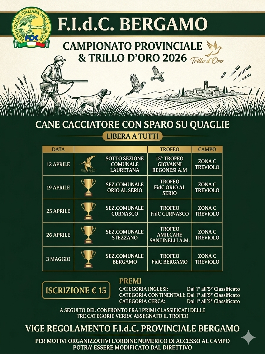 Federcaccia di Bergamo organizza il Campionato Provinciale e Trillo d’Oro 2026, dedicato al cane cacciatore con sparo su quaglie. La competizione è aperta a tutti e prevede premi per i primi 5 classificati nelle categorie Inglesi, Continentali e Cerca, con un trofeo speciale riservato al vincitore del confronto finale tra i primi classificati. Il calendario agonistico si svolgerà interamente presso la Zona C di Treviolo, iniziando il 12 aprile con il 15esimo Trofeo Giovanni Regonesi A.M. organizzato dalla Sotto Sezione Comunale Lauretana. Il 19 aprile sarà la volta del Trofeo FIdC Orio al Serio, seguito il 25 aprile dal Trofeo FIdC Curnasco, il 26 aprile dal Trofeo Amilcare Santinelli A.M. organizzato dalla sezione di Stezzano e, infine, il 3 maggio dal Trofeo FIdC Bergamo. Si ricorda che per tutte le gare vige il regolamento provinciale e che l’ordine di accesso al campo potrà subire variazioni per esigenze organizzative.
